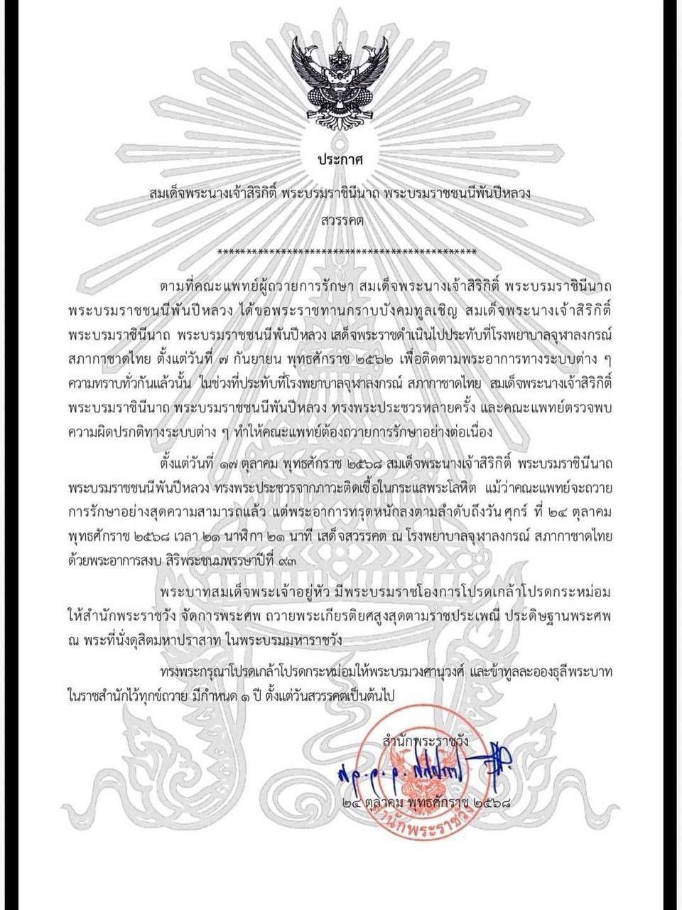 สำนักพระราชวัง เผยแพร่ประกาศ สมเด็จพระนางเจ้าสิริกิติ์ พระบรมราชินีนาถ พระบรมราชชนนีพันปีหลวง สวรรคต