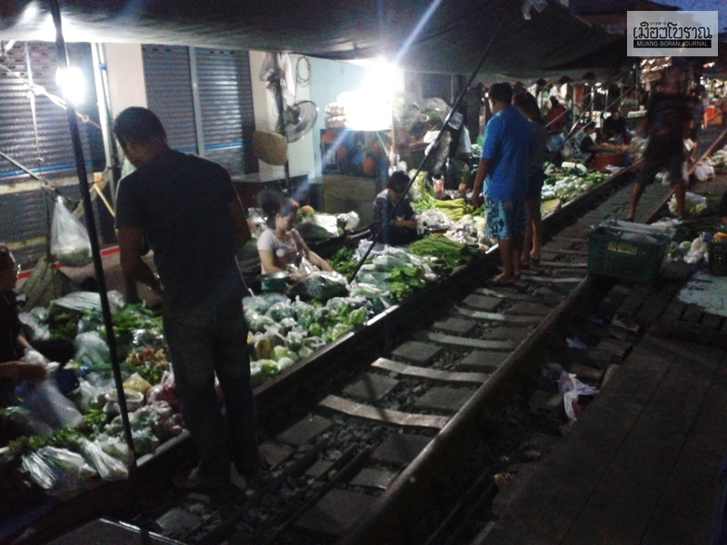 ตลาดร่มหุบริมทางรถไฟ เมื่อขบวนรถเคลื่อนผ่านจะต้องคอยหลบหลีกกัน