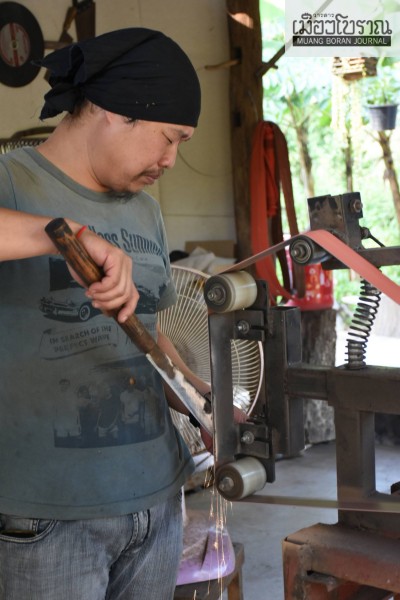 คุณชัยวัฒน์ ลือชา ช่างตีเหล็กฝีมือดีแห่งบ้านสันมะฮกฟ้า ปัจจุบันเลิกผลิตแล้วด้วยปัญหาสุขภาพ (ภาพจากนิตยสาร เข็มทิศเชียงใหม่)